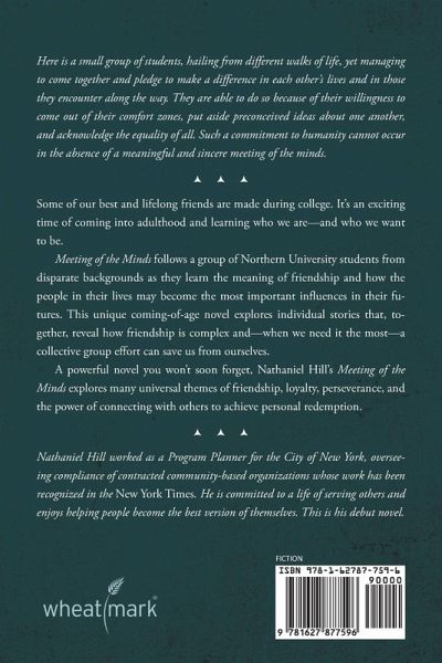 Here is a small group of students, hailing from different walks of life, yet managing to come together and pledge to make a difference in each other's lives and in those they encounter along the way. They are able to do so because of their willingness to come out of their comfort zones, put aside preconceived ideas about one another, and acknowledge the equality of all. Such a commitment to humanity cannot occur in the absence of a meaningful and sincere meeting of the minds. Some of our best and lifelong friends are made during college. It's an exciting time of coming into adulthood and learning who we are -- and who we want to be. Meeting of the Minds follows a group of Northern University students from disparate backgrounds as they learn the meaning of friendship and how the people in their lives may become the most important influences in their futures. This unique coming-of-age novel explores individual stories that, together, reveal how friendship is complex and -- when we need it the most -- a collective group effort can save us from ourselves. A powerful novel you won't soon forget, Nathaniel Hill's Meeting of the Minds explores many universal themes of friendship, loyalty, perseverance, and the power of connecting with others to achieve personal redemption.