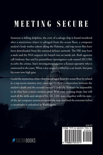 Meeting SECURE Someone is killing dolphins, the crew of a salvage ship is found murdered after a mysterious object is salvaged from the ocean floor, a computer analyst's body washes ashore along the Potomac, and top-secret files have been downloaded from the national defense network. The FBI may have a mole and the NSA suspects the breach was an inside job. Both agencies call Anthony Star and his paramilitary investigators code named SECURE to solve the crimes. Star's investigations uncover a Korean operative who is connected to the cases. When a key suspect is killed by a car bomb, Star puts his team into high gear. Could the mysterious object that was salvaged from the ocean floor be related to a top-secret mission sixty years ago? Is there a connection between the analyst's death and the security breach? Could the Korean's be responsible or do they have a more ominous plan? With time running short, Star will need all the skills and talents of his SECURE team, together with his state-of-the-art computer system to unravel the cases and find the terrorists before a catastrophe is unleashed in Washington.