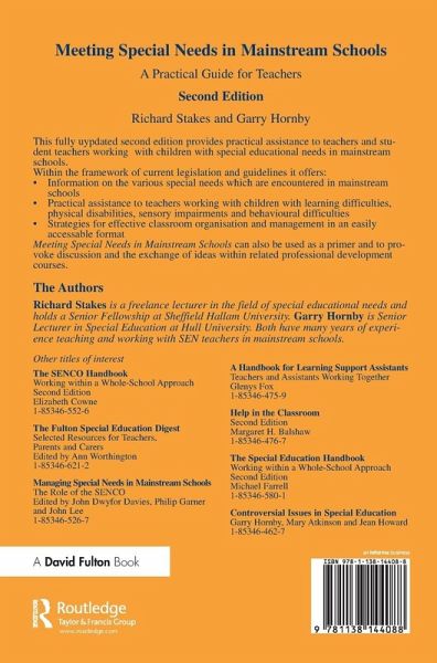 First Published in 2001. This fully updated second edition provides practical assistance to teachers and student teachers working with children with special educational needs in mainstream schools. Within the framework of current legislation and guidelines it offers: Information on the various special needs which are encountered in mainstream schools; Practical assistance to teachers working with children with learning difficulties, physical disabilities, sensory impairments and behavioural difficulties; Strategies for effective classroom organisation and management in an easily accessible format. Meeting Special Needs in Mainstream Schools can also be used as a primer and to provoke discussion and the exchange of ideas within related professional development courses.