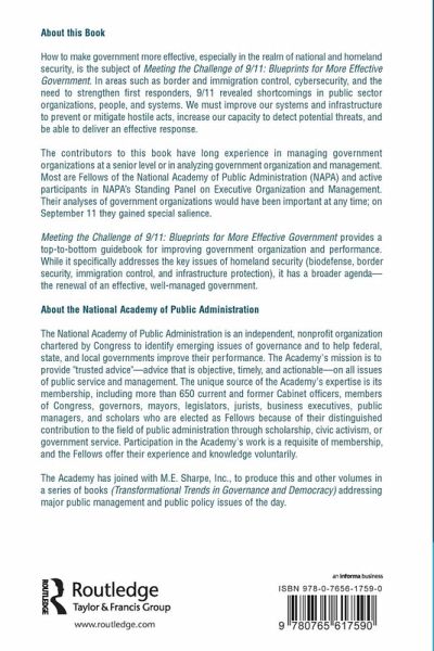 9/11 revealed serious public sector shortcomings in such areas as border security and immigration control, cybersecurity, and first responses to hostile acts. This book focuses on how to make government more effective, especially in our post-9/11 era of heightened concern for national and homeland security. "Meeting the Challenge of 9/11" is a top-to-bottom guidebook for improving government organization and performance. While it specifically addresses the key issues of homeland security (biodefense, border security, immigration control, and infrastructure protection), it has a broader agenda - the renewal of an effective, well-managed government. The chapter authors have extensive senior-level experience in managing government organizations or in analyzing government organization and management. Most are Fellows of the National Academy of Public Administration and active participants in NAPA's Standing Panel on Executive Organization and Management.