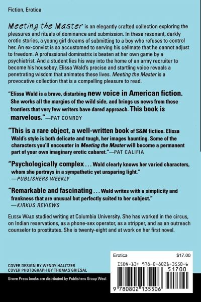A subtle, beautifully crafted collection, Meeting the Master introduces an accomplished new author whose lyrical economy and ability to see the erotic in everyday life make her a true pleasure to read. A young girl dreams of submitting to a boy who has no interest in controlling her; an ex-convict is so accustomed to servicing his cellmate that he cannot adjust to the outside world; a professional dominatrix explores her life with a psychiatrist; a student lies his way into the home of a stern older man in order to become his houseboy: Elissa Wald's characters embody a wide variety of voices - children, adults, gay, men, bi- and heterosexual women - and she presents them all with precision and an unusual clarity of vision.