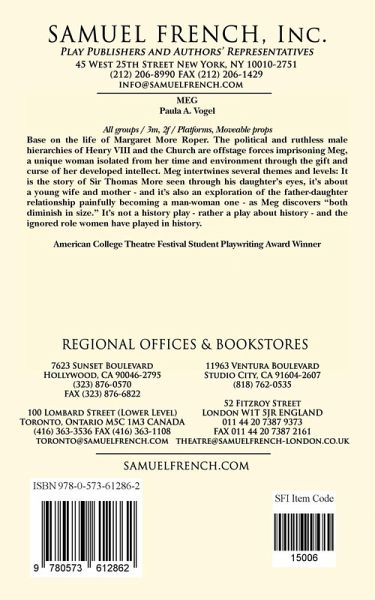 3m, 2f / Platforms, moveable props American College Theatre Festival Winner. Base on the life of Margaret More Roper. The political and ruthless male hierarchies of Henry VIII and the Church are offstage forces imprisoning Meg, a unique woman isolated from her time and environment through the gift and curse of her developed intellect. MEG intertwines several themes and levels: It is the story of Sir Thomas More seen through his daughter's eyes, it's about a young wife and mother - and it's also
