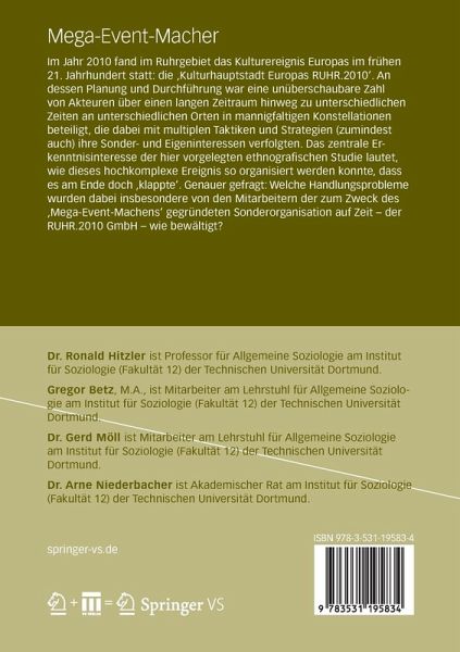 Im Jahr 2010 fand im Ruhrgebiet das Kulturereignis Europas im frühen 21. Jahrhundert statt: die 'Kulturhauptstadt Europas RUHR.2010'. An dessen Planung und Durchführung war eine unüberschaubare Zahl von Akteuren über einen langen Zeitraum hinweg zu unterschiedlichen Zeiten an unterschiedlichen Orten in mannigfaltigen Konstellationen beteiligt, die dabei mit multiplen Taktiken und Strategien (zumindest auch) ihre Sonder- und Eigeninteressen verfolgten. Das zentrale Erkenntnisinteresse der hier vorgelegten ethnografischen Studie lautet, wie dieses hochkomplexe Ereignis so organisiert werden konnte, dass es am Ende doch 'klappte'. Genauer gefragt: Welche Handlungsprobleme wurden dabei insbesondere von den Mitarbeitern der zum Zweck des 'Mega-Event-Machens' gegründeten Sonderorganisation auf Zeit - der RUHR.2010 GmbH - wie bewältigt?