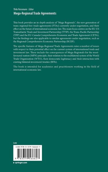 This book provides an in-depth analysis of "Mega-Regionals", the new generation of trans-regional free-trade agreements (FTAs) currently under negotiation, and their effect on the future of international economic law. The main focus centres on the EU-US Transatlantic Trade and Investment Partnership (TTIP), the Trans-Pacific Partnership (TPP) and the EU-Canada Comprehensive Economic and Trade Agreement (CETA), but the findings are also applicable to similar agreements under negotiation, such as the Regional Comprehensive Economic Partnership (RCEP).The specific features of Mega-Regional Trade Agreements raise a number of issues with respect to their potential effect on the current system of international trade and investment law. These include the consequences of Mega-Regionals for the most-favoured-nation (MFN) principle, their relation to the multilateral system of the World Trade Organization (WTO), their democratic legitimacy and their interaction with existing bilateral investment treaties (BITs).The book is intended for academics and practitioners working in the field of international economic law.