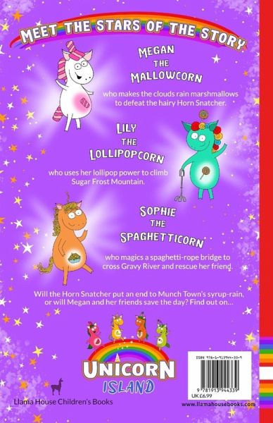 Welcome to UNICORN ISLAND, a whole world full of friendship, magic and adventure in this hilarious series for 4 - 8 year olds. Perfect for fans of The Naughtiest Unicorn, The Worst Witch, Care Bears and (of course) unicorns! More laughter and adventure than you can shake a horn at! Megan the Mallowcorn is celebrating her birthday in Bubblegum Park on a giant marshmallow bouncy-castle. But when the mischievous Horn Snatcher starts stealing sugar from the top of Sugar Frost Mountain, Megan is forced to use her unicorn power to stop the Munch Town meanie. Will making the clouds rain (very big) marshmallows be enough to stop the silly creature climbing up a mountain? Laugh along with Megan and her friends as they hilariously thwart the hairy Horn Snatcher in Book 1 of this best-selling series (starring Megan the Mallowcorn, Lily the Lollipopcorn and Sophie the Spaghetticorn), guaranteed to have all young readers laughing their horns off!