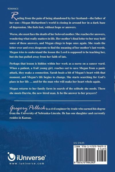 Reeling from the pain of being abandoned by her husband-the father of her son-Megan Richardson's world is closing in around her in a dark haze of depression. She feels lost, without hope or answers. Worse, she must face the death of her beloved mother. She reaches for answers, wondering what really matters in life. Her mother's final letter to her may hold some of these answers, and Megan clings to hope once again. She reads the letter over and over, desperate to find the meaning of her mother's last words. Megan tries to understand the lesson the Lord is supposed to be teaching her, but she has pulled away from her faith of late. Perhaps that lesson is hidden within her work as a nurse on a cancer ward. When a patient, a frail young girl, reaches out to save Megan from a panic attack, they make a connection. Sarah heals a bit of Megan's heart with that moment, and Megan's life begins to change. She starts searching for God's place in her life ... and for the man who will make her heart whole again. Megan returns to her family farm in search of the solitude she needs. There she meets Darrin, the new hired man. Is he the answer to her prayers?