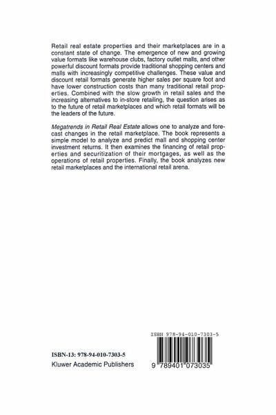 Megatrends in Retail Real Estate allows the reader to analyze and forecast changes in the retail marketplace. The book presents a simple model to analyze and predict mall and shopping center investment returns. It then examines the financing of retail properties and securitization of their mortgages, as well as the operations of retail properties. Finally, the book analyzes new retail marketplaces and the international retail arena.