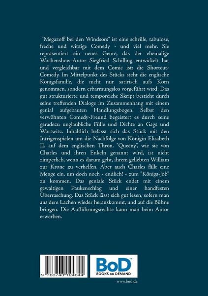 "Megazoff bei den Windsors" ist eine schrille, tabulose, freche und witzige Comedy - und viel mehr. Sie repräsentiert ein neues Genre, das der ehemalige Wochenshow-Autor Siegfried Schilling entwickelt hat und vergleichbar mit dem Comic ist: die Shortcut-Comedy. Im Mittelpunkt des Stücks steht die englische Königsfamilie, die nicht nur satirisch aufs Korn genommen, sondern erbarmungslos vorgeführt wird. Das gut strukturierte und temporeiche Skript besticht durch seine treffenden Dialoge im Zusammenhang mit einem genial aufgebauten Handlungsbogen. Selbst den verwöhnten Comedy-Freund begeistert es durch seine geradezu unglaubliche Fülle und Dichte an Gags und Wortwitz. Inhaltlich befasst sich das Stück mit den Intrigenspielen um die Nachfolge von Königin Elisabeth II. auf dem englischen Thron. "Queeny", wie sie von Charles und ihren Enkeln genannt wird, ist nicht zimperlich, wenn es darum geht, ihrem geliebten William zur Krone zu verhelfen. Aber auch Charles fällt eine Menge ein, um doch noch - endlich! - zum "Königs-Job" zu kommen. Das geniale Stück endet mit einem gewaltigen Paukenschlag und einer handfesten Überraschung. Das Stück lässt sich gut lesen, sofern man aus dem Lachen wieder herauskommt, und auf die Bühne bringen. Die Aufführungsrechte kann man beim Autor erwerben.