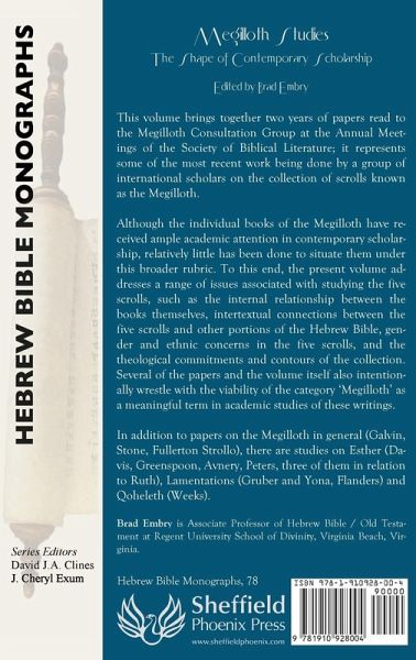 This volume brings together two years of papers read to the Megilloth Consultation Group at the Annual Meetings of the Society of Biblical Literature; it represents some of the most recent work being done by a group of international scholars on the collection of Hebrew Bible books known as the Megilloth. Although the individual books of the Megilloth have received ample academic attention in contemporary scholarship, relatively little has been done to situate them under this broader rubric. To this end, the present volume addresses a range of issues associated with studying the five scrolls, such as the internal relationship between the books themselves, intertextual connections between the five scrolls and other portions of the Hebrew Bible, gender and ethnic concerns in the five scrolls, and the theological commitments and contours of the collection. Several of the papers and the volume itself also intentionally wrestle with the viability of the category 'Megilloth' as a meaningful term in academic studies of these writings. In addition to papers on the Megilloth in general (Galvin, Stone, Fullerton Strollo), there are studies on Esther (Davis, Greenspoon, Avnery, Peters, three of them in relation to Ruth), Lamentations (Gruber and Yona, Flanders) and Qoheleth (Weeks).