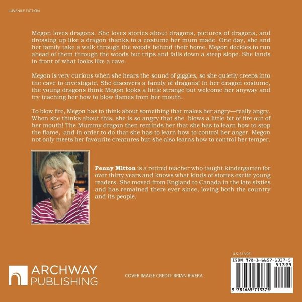 Megon loves dragons. She loves stories about dragons, pictures of dragons, and dressing up like a dragon thanks to a costume her mum made. One day, she and her family take a walk through the woods behind their home. Megon decides to run ahead of them through the woods but trips and falls down a steep slope. She lands in front of what looks like a cave. Megon is very curious when she hears the sound of giggles, so she quietly creeps into the cave to investigate. She discovers a family of dragons! In her dragon costume, the young dragons think Megon looks a little strange but welcome her anyway and try teaching her how to blow flames from her mouth. To blow fire, Megon has to think about something that makes her angry-really angry. When she thinks about this, she is so angry that she blows a little bit of fire out of her mouth! The Mummy dragon then reminds her that she has to learn how to stop the flame, and in order to do that she has to learn how to control her anger. Megon not only meets her favourite creatures but she also learns how to control her temper.