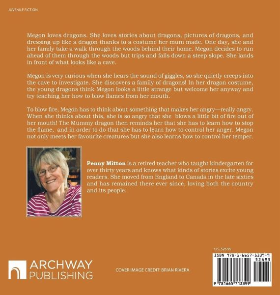 Megon loves dragons. She loves stories about dragons, pictures of dragons, and dressing up like a dragon thanks to a costume her mum made. One day, she and her family take a walk through the woods behind their home. Megon decides to run ahead of them through the woods but trips and falls down a steep slope. She lands in front of what looks like a cave. Megon is very curious when she hears the sound of giggles, so she quietly creeps into the cave to investigate. She discovers a family of dragons! In her dragon costume, the young dragons think Megon looks a little strange but welcome her anyway and try teaching her how to blow flames from her mouth. To blow fire, Megon has to think about something that makes her angry-really angry. When she thinks about this, she is so angry that she blows a little bit of fire out of her mouth! The Mummy dragon then reminds her that she has to learn how to stop the flame, and in order to do that she has to learn how to control her anger. Megon not only meets her favourite creatures but she also learns how to control her temper.