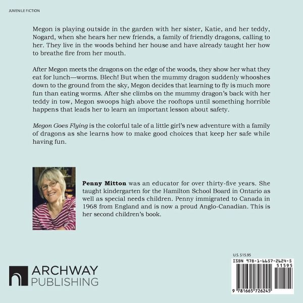 Megon is playing outside in the garden with her sister, Katie, and her teddy, Nogard, when she hears her new friends, a family of friendly dragons, calling to her. They live in the woods behind her house and have already taught her how to breathe fire from her mouth. After Megon meets the dragons on the edge of the woods, they show her what they eat for lunch-worms. Blech! But when the mummy dragon suddenly whooshes down to the ground from the sky, Megon decides that learning to fly is much more fun than eating worms. After she climbs on the mummy dragon's back with her teddy in tow, Megon swoops high above the rooftops until something horrible happens that leads her to learn an important lesson about safety. Megon Goes Flying is the colorful tale of a little girl's new adventure with a family of dragons as she learns how to make good choices that keep her safe while having fun.