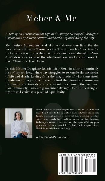 A Tale of an Unconventional Life and Courage Developed Through a Combination of Nature, Nurture, and Skills Acquired Along the Way. My mother, Meher, believed that we choose our lives for the lessons we will learn. These lessons flow into each of our lives for us to find a way to develop our innate emotional strength. There are no common methods or modalities for dealing with life's challenges as they arise, and so we all struggle until we discover our own unique blend of tools to navigate the journey. Meher & Me describes some of the situational lessons I am supposed to have 'chosen', which I have had to learn to deal with. One such lesson started with a phone call in the middle of the night that shook my world. "Your mother has been shot. We are taking her to hospital. You have to come home. Come quickly." In this Mother-Daughter Relationship Memoir, I share my struggles to reconcile the mysteries of life and death, and as I looked back, it was difficult to accept that I would have wished to be displaced as a child, or could have 'chosen' to have my father abandon me and my stepfather reject me. Would I really have picked a life where my mother was shot? Reeling from the magnitude of what transpired, I embarked on a journey inward to find the strength to overcome the harrowing tragedy, harnessing my inner strength to find meaning in my life, which ultimately brought me to a place of equanimity I sought. I hope that by sharing my memories of this life and the lessons it has dealt me, I will leave you with something you can take from my journey and use in your own life. For my mother Meher, who continues to watch over me.