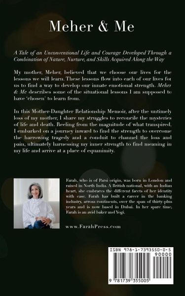 A Tale of an Unconventional Life and Courage Developed Through a Combination of Nature, Nurture, and Skills Acquired Along the Way. My mother, Meher, believed that we choose our lives for the lessons we will learn. These lessons flow into each of our lives for us to find a way to develop our innate emotional strength. There are no common methods or modalities for dealing with life's challenges as they arise, and so we all struggle until we discover our own unique blend of tools to navigate the journey. Meher & Me describes some of the situational lessons I am supposed to have 'chosen', which I have had to learn to deal with. One such lesson started with a phone call in the middle of the night that shook my world. "Your mother has been shot. We are taking her to hospital. You have to come home. Come quickly." In this Mother-Daughter Relationship Memoir, I share my struggles to reconcile the mysteries of life and death, and as I looked back, it was difficult to accept that I would have wished to be displaced as a child, or could have 'chosen' to have my father abandon me and my stepfather reject me. Would I really have picked a life where my mother was shot? Reeling from the magnitude of what transpired, I embarked on a journey inward to find the strength to overcome the harrowing tragedy, harnessing my inner strength to find meaning in my life, which ultimately brought me to a place of equanimity I sought. I hope that by sharing my memories of this life and the lessons it has dealt me, I will leave you with something you can take from my journey and use in your own life. For my mother Meher, who continues to watch over me.