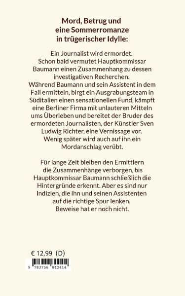 Mord, Betrug und eine Sommerromanze in trügerischer Idylle:Ein Journalist wird ermordet. Schon bald vermutet Hauptkommissar Baumann einen Zusammenhang zu dessen investigativen Recherchen. Während Baumann und sein Assistent in dem Fall ermitteln, birgt ein Ausgrabungsteam in Süditalien einen sensationellen Fund, kämpft eine Berliner Firma mit unlauteren Mitteln ums Überleben und bereitet der Bruder des ermordeten Journalisten, der Künstler Sven Ludwig Richter, eine Vernissage vor. Wenig später wird auch auf ihn ein Mordanschlag verübt.Für lange Zeit bleiben den Ermittlern die Zusammenhänge verborgen, bis Hauptkommissar Baumann schließlich die Hintergründe erkennt. Aber es sind nur Indizien, die ihn und seinen Assistenten auf die richtige Spur lenken. Beweise hat er noch nicht.