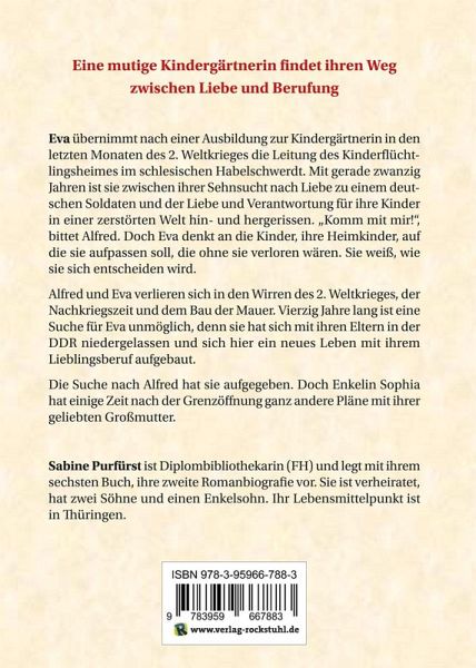 Autorin Sabine Purfürst, Taschenbuch, 248 SeitenÜBER DAS BUCH: Eine mutige Kindergärtnerin findet ihren Weg zwischen Liebe und Berufung.Eva übernimmt nach einer Ausbildung zur Kindergärtnerin in den letzten Monaten des 2. Weltkrieges die Leitung des Kinderflüchtlingsheimes im schlesischen Habelschwerdt. Mit gerade zwanzig Jahren ist sie zwischen ihrer Sehnsucht nach Liebe zu einem deutschen Soldaten und der Liebe und Verantwortung für ihre Kinder in einer zerstörten Welt hin- und hergerissen. "Komm mit mir!", bittet Alfred. Doch Eva denkt an die Kinder, ihre Heimkinder, auf die sie aufpassen soll, die ohne sie verloren wären. Sie weiß, wie sie sich entscheiden wird.Alfred und Eva verlieren sich in den Wirren des 2. Weltkrieges, der Nachkriegszeit und dem Bau der Mauer. Vierzig Jahre lang ist eine Suche für Eva unmöglich, denn sie hat sich mit ihren Eltern in der DDR niedergelassen und sich hier ein neues Leben mit ihrem Lieblingsberuf aufgebaut.Die Suche nach Alfred hat sie aufgegeben. Doch Enkelin Sophia hat einige Zeit nach der Grenzöffnung ganz andere Pläne mit ihrer geliebten Großmutter.