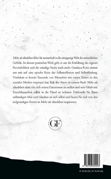 "Mehr als überleben" führt Sie meisterhaft in die einzigartige Welt der menschlichen Gefühle. In diesem poetischen Werk geht es um die Entfaltung der eigenen Persönlichkeit und die ständige Suche nach mehr. Gianluca Festa nimmt uns mit auf eine epische Reise der Selbstreflexion und Selbstfindung. Nachdem er bereits Tausende von Menschen mit seinen Texten in den sozialen Medien inspiriert hat, lädt der Autor in seinem zweiten Buch "Mehr als überleben" dazu ein, sich seinen Emotionen zu stellen und sein Glück mit Entschlossenheit selbst in die Hand zu nehmen. Entfesseln Sie Ihren unbändigen Mut und Glauben an sich selbst und lassen Sie sich von den tiefgründigen Texten in Mehr als überleben inspirieren.