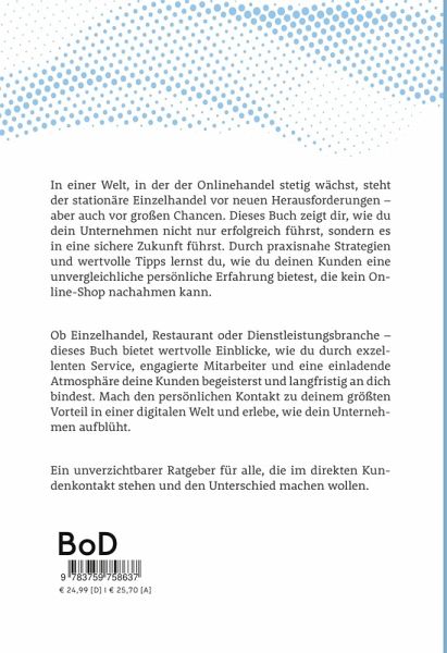 Die Zukunft gehört denen, die Service neu denken. Erfolg beginnt beim Menschen, bei Kund*innen, Mitarbeitenden und der gelebten Servicekultur. Dieses Buch zeigt, wie du mit exzellentem Service, klarer Führung und einer motivierenden Unternehmenskultur den Unterschied machst. Ob Einzelhandel, Gastronomie oder Dienstleistungsbetrieb: Überall entscheidet heute das Kundenerlebnis über den Erfolg. Der Autor vermittelt praxisnahe Strategien, um Kundenzufriedenheit, Mitarbeitermotivation und Unternehmensziele in Einklang zu bringen. Dabei geht es nicht um kurzfristige Maßnahmen, sondern um…mehr