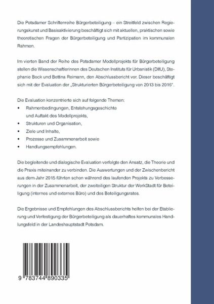 Die Potsdamer Schriftenreihe Bürgerbeteiligung - ein Streitfeld zwischen Regierungskunst und Basisaktivierung beschäftigt sich mit aktuellen, praktischen sowie theoretischen Fragen der Bürgerbeteiligung und Partizipation im kommunalen Rahmen.Im vierten Band der Reihe des Potsdamer Modellprojekts für Bürgerbeteiligung stellen die Wissenschaftlerinnen des Deutschen Instituts für Urbanistik DIfU, Stephanie Bock und Bettina Reimann, den Abschlussbericht vor. Dieser beschäftigt sich mit der Evaluation der Strukturierten Bürgerbeteiligung von 2013 bis 2016.Die Evaluation konzentrierte sich auf folgende Themen:- Rahmenbedingungen, Entstehungsgeschichte und Auftakt des Modellprojekts,- Strukturen und Organisation,- Ziele und Inhalte,- Prozesse und Zusammenarbeit sowie- Handlungsempfehlungen.Die begleitende und dialogische Evaluation verfolgte den Ansatz, die Theorie und die Praxis miteinander zu verbinden. Die Auswertungen und der Zwischenbericht aus dem Jahr 2015 führten schon während des laufenden Projekts zu Verbesserungen in der Zusammenarbeit, der zweiteiligen Struktur der WerkStadt für Beteiligung - internes und externes Büro - und des Beteiligungsrates.Die Ergebnisse und Empfehlungen des Abschlussberichts helfen bei der Etablierung und Verfestigung der Bürgerbeteiligung als dauerhaftes kommunales Handlungsfeld in der Landeshauptstadt Potsdam.