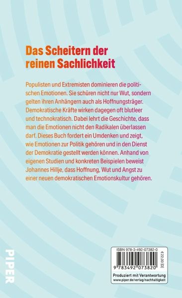 Populisten und Extremisten dominieren die politischen Emotionen. Sie schüren nicht nur Wut, sondern gelten ihren Anhängern auch als Hoffnungsträger. Demokratische Kräfte wirken dagegen oft blutleer und technokratisch. Dabei lehrt die Geschichte, dass man die Emotionen nicht den Radikalen überlassen darf. Dieses Buch fordert ein Umdenken und zeigt, wie Emotionen zur Politik gehören und in den Dienst der Demokratie gestellt werden können. Anhand von eigenen Studien und konkreten Beispielen beweist Johannes Hillje, dass Hoffnung, Wut und Angst zu einer neuen demokratischen Emotionskultur gehören.
