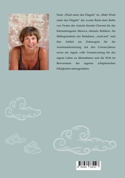 Nach "Wind unter den Flügeln" ist "Mehr Wind unter den Flügeln" der zweite Band einer Zusammenstellung von Texten der Autorin Kerstin Chavent für das Internetmagazin Manova, vormals Rubikon. Als Mitbegründerin der Redaktion "Aufwind" sind ihre Artikel gleichermaßen ein Zeitzeugnis für die Auseinandersetzung mit den Corona-Jahren sowie ein Appel, Verantwortung für das eigene Leben zu übernehmen und - ganz im Sinne ihrer bereits erschienen Bücher "Krankheit heilt", "Das Licht fliesst dahin, wo es dunkel ist","Die Waffen niederlegen","In guter Gesellschaft", "Die Enthüllung", "Der Königsweg" und "Die wilde Göttin" - die Welt im Bewusstsein der eigenen schöpferischen Fähigkeiten mitzugestalten.