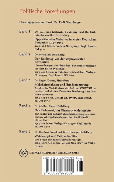 Diese Studie entstand im Zusammenhang mit einem größeren Projekt empirischer Forschungen zu Problemen der parlamenta rischen Regierungsweise, die von Mitgliedern des Instituts für Politische Wissenschaft an der Universität Heidelberg unter der Leitung von Prof. Dr. Dolf Sternberger betrieben werden. Die Arbeit wurde dem Verfasser durch ein Forschungsstipendium der Ford-Foundation möglich gemacht. Ihr und dem erwähnten Institut ist er deshalb zu besonderem Dank verpflichtet. Vorab möchte ich Herrn Professor Dolf Sternberger herzlich für alle Hilfe und verständnisvolle Beratung, ohne welche diese Arbeit unmöglich gewesen wäre, danken. In der Zusammen arbeit mit ihm habe ich Sinn, Rang und Wert parlamentarischer Regierungsweise erkennen gelernt. Mein weiterer Dank gilt meinen Kollegen Dr. Wolfgang Kra lewski, Dr. Arnd Morkel, Dr. Bernhard Vogel und Anton Wam bach. Im ständigen Gespräch mit ihnen und mit ihrer Kritik und Hilfe wurden die notwendigen Studien und überlegungen vor angetrieben. Zu besonderem Dank aber bin ich vielen Abgeordneten der Bundestagsfraktion der CDU/CSU verpflichtet, die - ebenso wie die Angestellten der Fraktions-Geschäftsführung - mit gro ßem Verständnis und freundlicher Bereitwilligkeit mir den Zu gang zu wesentlichen Materialien öffneten und eine Fülle von Fragen geduldig beantworteten. Die Beamten des Presse-Archivs und der Bibliothek des Deut schen Bundestages haben mir durch ihr Entgegenkommen die Arbeit erleichtert. Auch ihnen sei Dank, ebenso den Studenten der Philosophie Sybil und Roland Schrag für ihre technische Hilfe bei der Niederschrift der Studie und Herrn Gerhard Wey gandt MA (Heidelberg), der freundlicherweise die Bearbeitung der Korrektur übernahm.