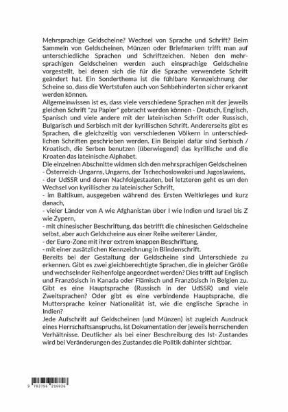 Mehrsprachige Geldscheine? Wechsel von Sprache und Schrift? Beim Sammeln von Geldscheinen, Münzen oder Briefmarken trifft man auf unterschiedliche Sprachen und Schriftzeichen. Neben den mehrsprachigen Geldscheinen werden auch einsprachige Geldscheine vorgestellt, bei denen sich die für die Sprache verwendete Schrift geändert hat. Ein Sonderthema ist die fühlbare Kennzeichnung der Scheine so, dass die Wertstufen auch von Sehbehinderten sicher erkannt werden können. Allgemeinwissen ist es, dass viele verschiedene Sprachen mit der jeweils gleichen Schrift "zu Papier" gebracht werden können - Deutsch, Englisch, Spanisch und viele andere mit der lateinischen Schrift oder Russisch, Bulgarisch und Serbisch mit der kyrillischen Schrift. Andererseits gibt es Sprachen, die gleichzeitig von verschiedenen Völkern in unterschiedlichen Schriften geschrieben werden. Ein Beispiel dafür sind Serbisch / Kroatisch, die Serben benutzen (überwiegend) das kyrillische und die Kroaten das lateinische Alphabet.Die einzelnen Abschnitte widmen sich den mehrsprachigen Geldscheinen- Österreich-Ungarns, Ungarns, der Tschechoslowakei und Jugoslawiens, - der UdSSR und deren Nachfolgestaaten, bei letzteren geht es um den Wechsel von kyrillischer zu lateinischer Schrift,- im Baltikum, ausgegeben während des Ersten Weltkrieges und kurz danach, - vieler Länder von A wie Afghanistan über I wie Indien und Israel bis Z wie Zypern,- mit chinesischer Beschriftung, das betrifft die chinesischen Geldscheine selbst, aber auch Geldscheine aus einer Reihe weiterer Länder, - der Euro-Zone mit ihrer extrem knappen Beschriftung,- mit einer zusätzlichen Kennzeichnung in Blindenschrift.Bereits bei der Gestaltung der Geldscheine sind Unterschiede zu erkennen. Gibt es zwei gleichberechtigte Sprachen, die in gleicher Größe und wechselnder Reihenfolge angeordnet werden? Dies trifft auf Englisch und Französisch in Kanada oder Flämisch und Französisch in Belgien zu. Gibt es eine Hauptsprache (Russisch in der UdSSR) und viele Zweitsprachen? Oder gibt es eine verbindende Hauptsprache, die Muttersprache keiner Nationalität ist, wie die englische Sprache in Indien?Jede Aufschrift auf Geldscheinen (und Münzen) ist zugleich Ausdruck eines Herrschaftsanspruchs, ist Dokumentation der jeweils herrschenden Verhältnisse. Deutlicher als bei einer Beschreibung des Ist-Zustandes wird bei Veränderungen des Zustandes die Politik dahinter sichtbar.
