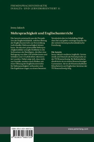 Die Autorin untersucht aus der Perspektive der Englischdidaktik, welchen Beitrag der Englischunterricht zur Entwicklung individueller Mehrsprachigkeit leisten kann. Sie skizziert potenzielle Mehrsprachigkeitsfelder und gibt Einblicke in die Sichtweisen der Beteiligten, die über eine Befragung von über 250 Schülerinnen und Schülern und 15 Lehrkräften rekonstruiert wurden. Dabei zeigt sich, dass nicht nur Vorteile, sondern auch Risiken mit einer Öffnung des Englischunterrichts für Mehrsprachigkeit verbunden sind. Die Ergebnisse tragen zu einem besseren Verständnis des im Schulalltag Möglichen bei und geben wichtige Impulse für die weitere fremdsprachendidaktische Forschung.
