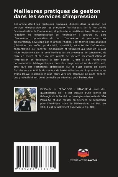 Cet article décrit les meilleures pratiques utilisées dans la gestion des services d'impression par les principaux fournisseurs sur le marché de l'externalisation de l'impression, et présente le modèle en trois étapes pour l'adoption de l'externalisation de l'impression : contrôle du parc d'impression, optimisation du parc d'impression et promotion des améliorations, développé par le groupe Photizo. Sept thèmes sont analysés (réduction des coûts, productivité, durabilité, sécurité de l'information, concentration sur l'activité, disponibilité et flexibilité) qui sont de la plus haute importance car ils sont intrinsèques au processus de conception, de mise en oeuvre et de suivi des projets de services d'externalisation de l'impression et essentiels à leur succès. Grâce à des recherches documentaires, bibliographiques, dans des magazines et sur des sites web, ainsi qu'à des recherches spécialisées sur le sujet auprès de divers fournisseurs et entités du secteur de l'externalisation de l'impression, nous avons trouvé le chemin le plus court vers une structure de coûts allégée, une productivité accrue et de meilleurs résultats pour l'entreprise.