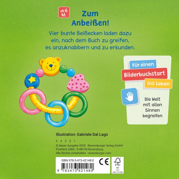 Dieses Buch haben Babys zum Fressen gern! Denn vier farbenfrohe Beißecken wecken die Entdeckerlust von Kindern ab 6 Monaten. In diesem Alter wird gern alles in den Mund genommen. Deshalb sind die genoppten Kunststoffecken beim Knabbern, Kauen und Beißen besonders spannend für Babys, ganz besonders, wenn dann auch noch die ersten Zähne kommen. Die Beißecken sind extrastabil, abwaschbar und aus unbedenklichen Materialien.