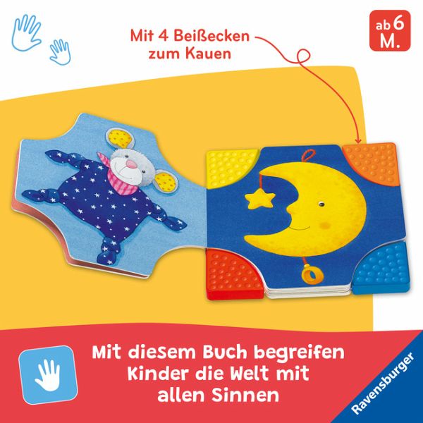 Mit diesem Buch darf geknabbert, gelutscht und gekaut werden. Die Ecken sind extra für Babys entwickelt worden, damit sie dieses Buch mit allen Sinnen erforschen können. Denn Babys entdecken in diesem Alter vor allem mit dem Mund! Teddybär, Banane, Mond oder Kuschelmaus: beim Betrachten der farbenfrohen Bilder schulen die Kleinen spielerisch ihre Wahrnehmung und lernen ganz nebenbei Sprechen.