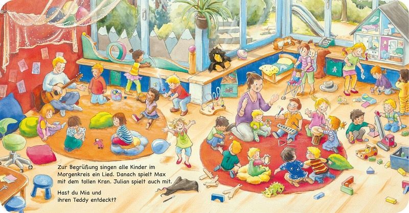 Robustes Mini-Wimmelbuch für kleine Kinderhände - ideal für unterwegs Mit vielen Suchaufgaben rund um Morgenkreis, Mittagessen, Malen und mehrFördert spielerisch die Sprachentwicklung, Konzentration und den Wortschatz