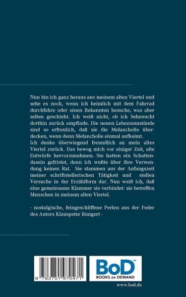 Vor einiger Zeit erwarb ich ein Haus in einem anderen Stadtteil und verließ mein altes Viertel. Nun ist es nicht mehr meins.Ich habe lange dort gewohnt. Mit Ausnahme der ersten Lebensjahre und einer kurzen Unterbrechung für den Wehrdienst eigentlich immer. Ach ja, den einen oder andern Urlaub gab es auch noch, kaum der Rede wert. Ich bin ein schlimmer Reisemuffel. Jedenfalls nach außen. In Wahrheit reise ich ständig. In Gedanken. Die Umstände des äußeren Reisens sind mir lästig. Wie sagte ein alter Mathematiker: Stör mir meine Kreise nicht.Nun bin ich ganz heraus aus meinem alten Viertel und sehe es noch, wenn ich heimlich mit dem Fahrrad durchfahre oder einen Bekannten besuche, was aber selten geschieht.Ich weiß nicht, ob ich Sehnsucht dorthin zurück empfinde. Die neuen Lebensumstände sind so erfreulich, daß sie die Melancholie überdecken, wenn denn Melancholie einmal aufkeimt. Ich denke überwiegend freundlich an mein altes Viertel zurück.Das bewog mich vor einiger Zeit, alte Entwürfe hervorzunehmen. Sie hatten ein Schattendasein gefristet, denn ich wußte über ihre Verwendung keinen Rat. Sie stammen aus der Anfangszeit meiner schriftstellerischen Tätigkeit und stellen Versuche in der Erzählform dar. Nun weiß ich, daß eine gemeinsame Klammer sie verbindet: sie betreffen Menschen in meinem alten Viertel.- nostalgische, feingeschliffene Perlen aus der Feder des Autors Klauspeter Bungert -
