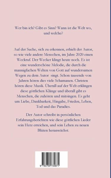 Wer bin ich? Gibt es Sinn? Wann ist die Welt wo, und welche?Auf der Suche, sich zu erkennen, erhielt der Autor, so wie viele andere Menschen, im Jahre 2020 einen Weckruf. Der Wecker klingt heute noch. Es ist eine wunderschöne Melodie, die durch die mannigfachen Welten von Gott auf wundersamen Wegen zu dem Autor singt. Schon tausende von Jahren hören dies viele Schamanen. Christen hören diese Musik. Überall auf der Welt erklingen diese göttlichen Klänge und überall gibt es Menschen, die zuhören und mitsingen. Es geht um Liebe, Dankbarkeit, Hingabe, Frieden, Leben, Tod und das Paradies.Der Autor schreibt in persönlichen Erfahrungsberichten wie diese göttlichen Lieder sein Herz erreichen, und sein Leben zu neuen Blüten heranwächst.