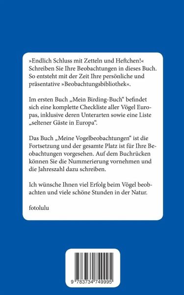 »Endlich Schluss mit Zetteln und Heftchen!« Schreiben Sie Ihre Beobachtungen in dieses Buch. So entsteht mit der Zeit Ihre persönliche und präsentative »Beobachtungsbibliothek«.Im ersten Buch "Mein Birding-Buch" befindet sich eine komplette Checkliste aller Vögel Europas, inklusive deren Unterarten sowie eine Liste "seltener Gäste in Europa".Das Buch "Meine Vogelbeobachtungen" ist die Fortsetzung und der gesamte Platz ist für Ihre Beobachtungen vorgesehen. Auf dem Buchrücken können Sie die Nummerierung vornehmen und die Jahreszahl dazu schreiben.Ich wünsche Ihnen viel Erfolg beim Vögel beobachten und viele schöne Stunden in der Natur.fotolulu