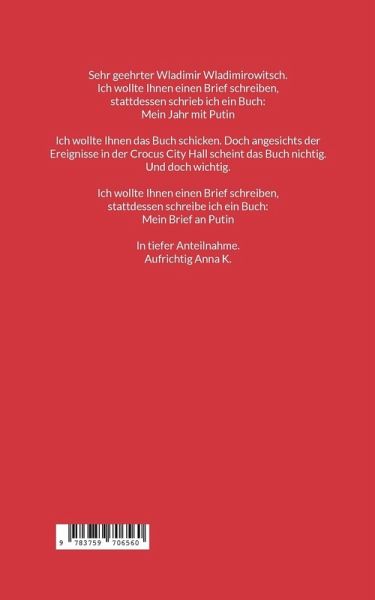 Sehr geehrter Wladimir Wladimirowitsch.Ich wollte Ihnen einen Brief schreiben,stattdessen schrieb ich ein Buch:Mein Jahr mit PutinIch wollte Ihnen das Buch schicken. Doch angesichts derEreignisse in der Crocus City Hall scheint das Buch nichtig.Und doch wichtig.Ich wollte Ihnen einen Brief schreiben,stattdessen schreibe ich ein Buch:Mein Brief an PutinIn tiefer Anteilnahme.Aufrichtig Anna K.