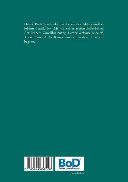 Dieses Buch beschreibt das Leben des Ablasshändlers Johann Tetzel, der sich mit seiner marktschreierischen Art Luthers Unwillen zuzog. Luther verfasste seine 95 Thesen, worauf der Kampf um den "wahren Glauben" begann.
