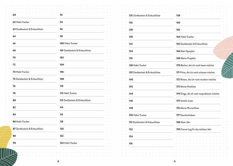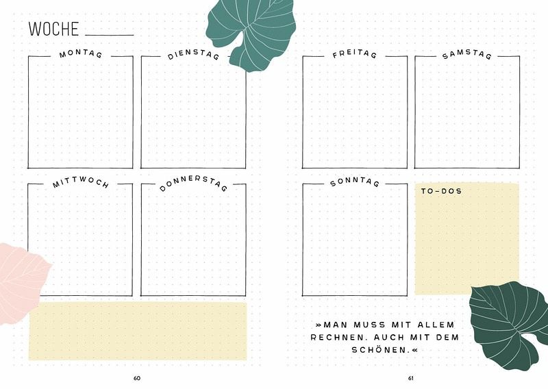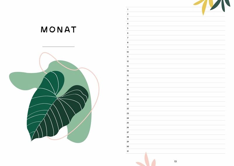 Enthält fertig gestaltete Wochenübersichten, To-do-Listen, Future Log und Gewohnheitstracker für einen schnellen Start mit deinem neuen Journal192 Seiten mit wunderschönen botanischen Designs: Bananenblatt, Monstera, Calathea und viele andere bringen Abwechslung in deine Wochen- und MonatsplanungDas Hardcover im praktischen DIN A5 Format ist der perfekte Alltagsbegleiter und übersteht jede Reise im Rucksack oder der Handtasche