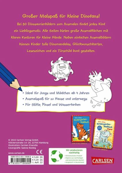 Dieser dicke Malblock ist gefüllt mit zahlreichen Ausmalbildern von bekannten und weniger bekannten Dinosauriern: Archaeopteryx, Plesiosaurus, Brachiosaurus, T-Rex, Giraffatitan und viele weitere. Die einfachen Bilder mit klaren Konturen erleichtern das Ausmalen für Kinder. Doch in dem Malblock warten nicht nur einfache Ausmalbilder, sondern tolle Extras: Dino-Mandalas, Glückwunschkarten, Lesezeichen und ein Türschild.