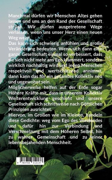 Manchmal dürfen wir Menschen Altes gehen lassen und uns an den Rand der Gesellschaft stellen. Wir dürfen ausgetretene Wege verlassen, wenn uns unser Herz einen neuen Weg weist. Das kann sich schwierig anfühlen und große Veränderung bedeuten. Wenn sich dann eine ganze Gesellschaft einmal so verbessert, dass sie sich nicht mehr ans Ego klammert, sondern wirklich nachhaltig wird und jeden Menschen respektvoll und wertschätzend annimmt, dann kann das für ein gesamtes Kollektiv neu und ungewohnt sein. Möglicherweise helfen auf der Erde sogar Höhere Kräfte mit, dass in unserem Kollektiv Weiterentwicklung geschieht und unsere Gesellschaft sich schrittweise nach Göttlichen Prinzipien ausrichtet. Hiervon, im Großen wie im Kleinen, handeln diese Gedichte: weg vom Ego des Verstandes und dafür hin zur Verbindung und Verschmelzung mit dem Höheren Selbst, hin zu wahrer Gemeinschaft und zu einer lebensbejahenden Menschheit.