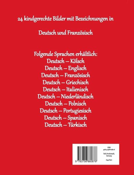 24 kindgerechte Bilder mit Bezeichnungen inDeutsch und FranzösischFolgende Sprachen erhältlich:Deutsch - KölschDeutsch - EnglischDeutsch - FranzösischDeutsch - GriechischDeutsch - ItalienischDeutsch - NiederländischDeutsch - PolnischDeutsch - PortugiesischDeutsch - SpanischDeutsch - Türkisch
