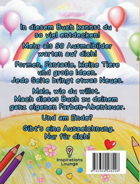 "Mein erstes Ausmalbuch - Formen & Farben entdecken" ist ein liebevoll gestaltetes Kritzel-Malbuch für Kinder ab 2 Jahren. Mit über 50 klaren, großflächigen Ausmalbildern im A4-Format lädt es kleine Künstler dazu ein, spielerisch Farben und Formen kennenzulernen. Ob runde Äpfel, verträumte Sterne, lustige Tiere oder erste Fahrzeuge - auf jeder Seite warten mehrere kindgerechte Motive, die zum Vergleichen, Erkennen und Ausmalen einladen.Begleitende kleine Texte sprechen die Kinder auf Augenhöhe an und fördern spielerisch den Wortschatz, die Sprachentwicklung und das genaue Hinsehen. Die ruhige Gestaltung ohne überladene Hintergründe ermöglicht eine entspannte und kreative Beschäftigung - ideal für zu Hause, Kindergarten oder unterwegs.Das Buch fördert Kreativität, Feinmotorik, Wahrnehmung und erstes Lernen in einem. Am Ende wartet eine besondere Überraschung: der Farbenheld-Pokal - eine Auszeichnung, die das Kind für seine Fantasie und Ausdauer erhält. So wird jedes Ausmalen zu einem echten Erlebnis mit bleibender Erinnerung.Ein erstes Malbuch für Kinder ab 2 Jahren, das nicht nur ausgemalt, sondern erlebt wird - ideal als Geschenk, für gemeinsame Momente oder die tägliche kreative Auszeit.