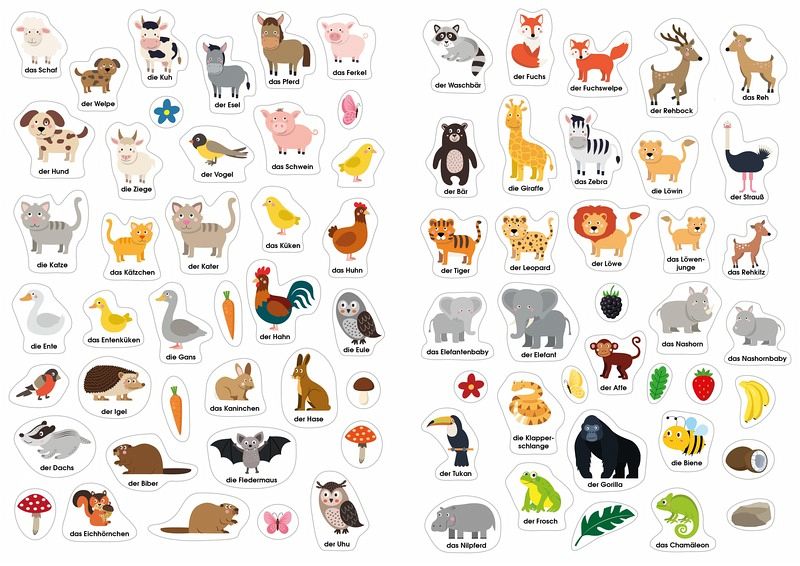 Fröhlich stickern und dabei Wörter lernen Stickerbücher sind bei Kindern sehr beliebt! Hintergründe werden mit bunten Aufklebern zum Leben erweckt und neue Welten entstehen. Schon ab 3 Jahren können die Kleinen selbstständig stickern, spielen und Wörter lernen. Durch die 250 großflächigen Stickern entstehen lustige Geschichten rund um die Tiere dieser Welt. Das Aufkleben fördert spielend die Koordination und die Feinmotorik, mit den fröhlich-bunten Illustrationen, Bildwörtern und kurzen Texten wird das erste Sachwissen vermittelt. Dadurch entsteht ein wunderschönes Bilderbuch, das immer wieder angeschaut werden kann.