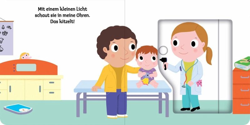 Bunte, leicht zu erkennende Bilder, eine klare Aufteilung und nicht zu viel auf einer Seite: Hier können schon Kinder ab 18 Monaten in die Welt entdecken. Die lustigen und stabilen Schiebeelemente im Buch fördern die Feinmotorik und das Verständnis. Einfach die lustigen Schieber bewegen und verstehen, was im Wartezimmer, am Empfang oder im Behandlungszimmer passiert.