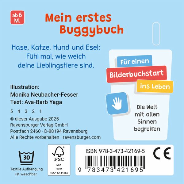 Esel, Kaninchen und Hund: in diesem Spielbuch können Kinder ab 6 Monaten ihre Lieblingstiere streicheln und anfassen. Die kurzen Texte und die Fühlteile animieren dabei zum aktiven Mitmachen.
