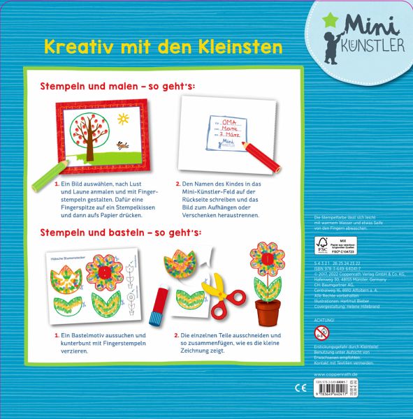 Fingerstempeln, malen und basteln! Die 16 Motive können mit den 4 Stempelfarben kunterbunt gestaltet werden. Bei den Bastelmotiven werden zudem einzelne Teile ausgeschnitten und so zusammengefügt, wie es die kleine Zeichnung auf der jeweiligen Seite zeigt. Für den Namen des kleinen Künstlers oder der kleinen Künstlerin ist jeweils ein Feld auf der Rückseite vorgesehen.