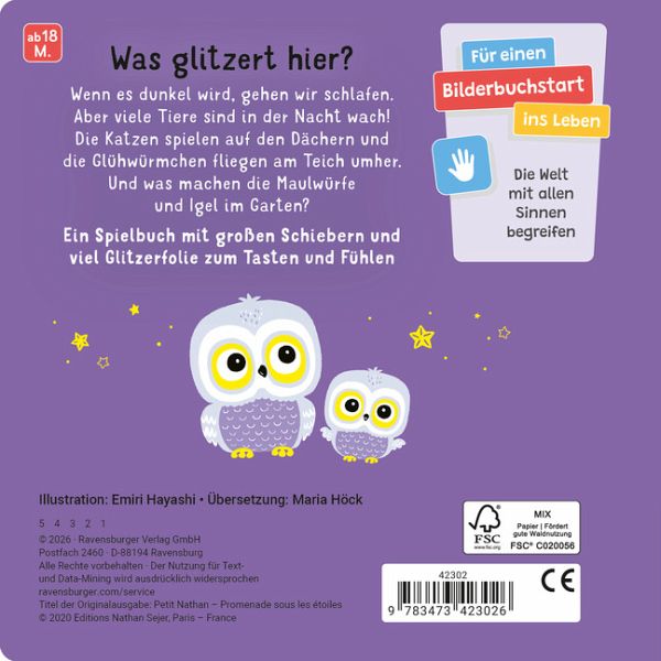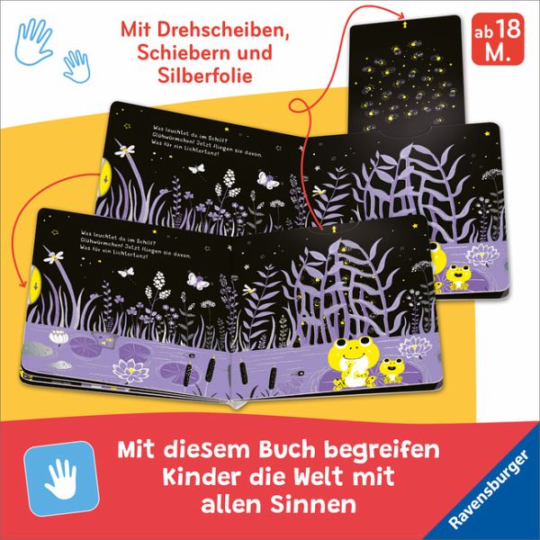 Was machen die Tiere draußen in der Nacht? Die Katzen spielen Verstecken, die Eule fliegt über die Bäume und die Frösche sehen den tanzenden Glühwürmchen zu.