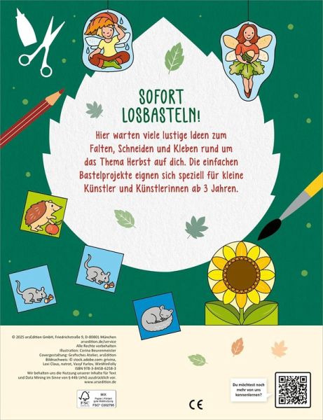 Sofort losbasteln: Mit diesem Heft kann sofort losgebastelt werden, man benötigt nur Kleber, Schere, Stifte und Material, das jeder zu Hause hatAb 3 Jahren: Erstes Bastelbuch für Kindergartenkinder mit herbstlichen Bastelideen und altersgerechten AnleitungenAbwechslungsreich: Ein Leporello mit herbstlicher Szene, ein stimmungsvolles Mobile oder ein selbst gemachter Bilderrahmen - hier findet jedes Kind sein Lieblings-BastelprojektFördert und fordert: Der erste Umgang mit Schere und Klebestift und das Falten von Papier fördern gezielt Feinmotorik, Konzentration und KombinationsvermögenEin ideales Geschenk: Ob zum Beginn der Herbstferien, für Halloween oder als Mitbringsel einfach so - hier werden die Kleinen zu großen Künstlern