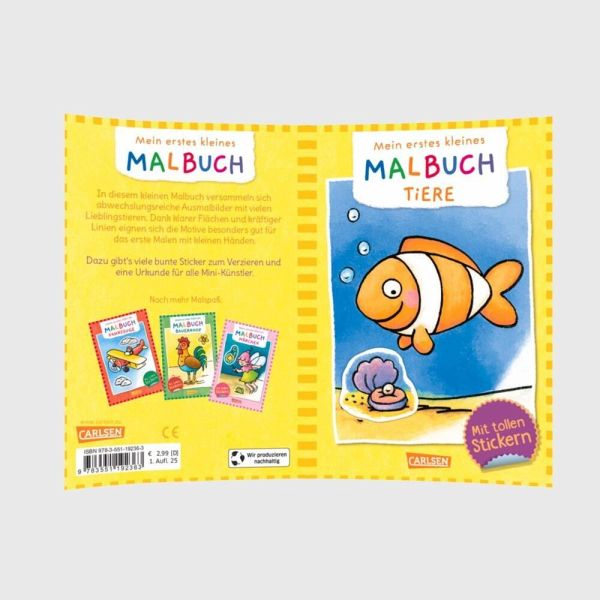 In diesem kleinen Malbuch versammeln sich abwechslungsreiche Ausmalbilder mit vielen Lieblingstieren. Dank klarer Flächen und kräftiger Linien eignen sich die Motive besonders gut für das erste Malen mit kleinen Händen. Dazu gibt's viele bunte Sticker zum Verzieren und eine Urkunde für alle Mini-Künstler.