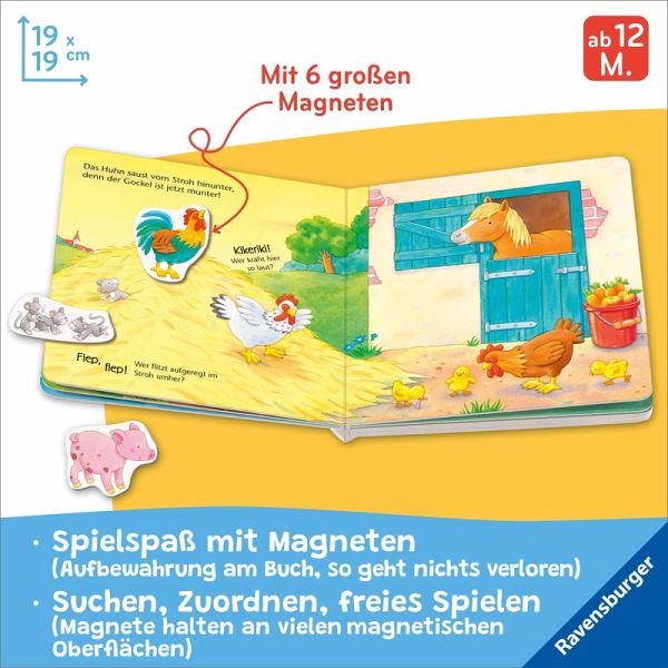 Auf dem Bauernhof wird wild gespielt: Vergnügt suhlen sich die Ferkel im Matsch und die Gänse planschen am Wasser. Und die Mäuse? Die flitzen aufgeregt im Stroh umher. In diesem Magnet-Spielbuch können Kleinkinder ab 1 Jahr verschiedene Magnete zuordnen oder frei auf den magnetischen Seiten spielen. Das fördert die Kreativität und die Feinmotorik. Die sechs großen und stabilen Magnete sind auch für kleine Kinderhände leicht zu greifen.
